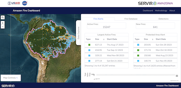 The Amazon Dashboard is based on a new near-real time methodology (Andela et al., 2022) to cluster satellite active fire detections into individual fire events, and classify each event as one of four different Amazon fire types. We differentiate deforestation fires, understory forest fires, small clearing or agricultural fires, and savanna and grassland fires. The algorithm tracks five metrics of fire behavior for each individual fire. These metrics of fire behavior are subsequently combined with information on land cover and historic deforestation within the fire perimeter to identify the specific fire type and confidence class (low, moderate, high) for each event. The dashboard can be accessed here.