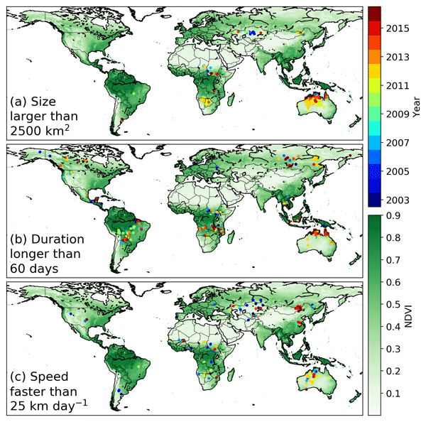 Location and year of the largest, longest, and fastest fires over the study period 2003-2016.