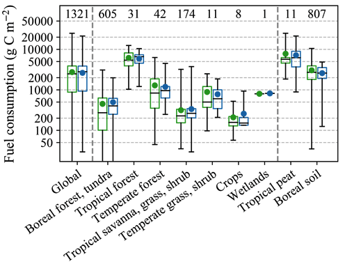 The higher spatial resolution did not lead to substantial differences with GFED4s emission estimates (both 2.1 Pg C per year on a global scale), but it did make for a more thorough evaluation against field-measured fuel consumption. This resulted in somewhat higher fuel consumption estimates in the model, compensated for by somewhat lower burned area in the MCD64A1 C6 dataset compared to GFED4s. The fuel consumption estimates derived in this paper are the basis for the conversion of burned area to emissions in GFED5 which has substantially more burned area. Emissions from this datasets are therefore conservative but they are recommended for regional analyses where the increased spatial resolution is beneficial. Efforts are underway to expand the data to include the years 2021 and 2022.